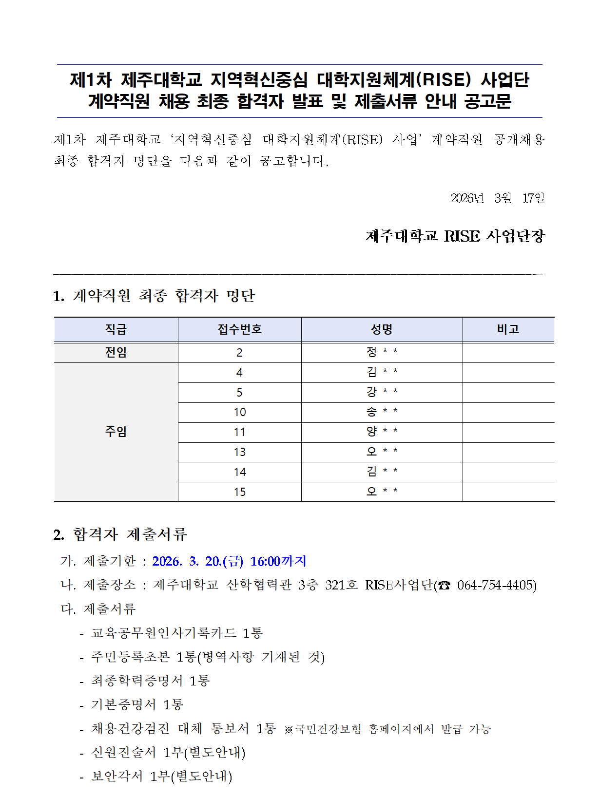 제1차 제주대학교 지역혁신중심 대학지원체계(RISE) 사업단 계약직원 채용 최종 합격자 발표 및 제출서류 안내 공고